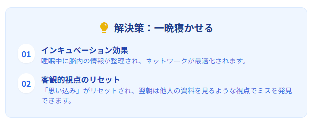 翌朝、フレッシュな状態で資料を開くと、まるで他人の資料を見ているかのような客観的な視点が働き、前夜にはどうしても見えなかったミスが浮かび上がってくるのです。