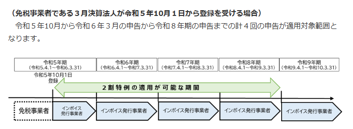 2割特例を適用できるのは、令和5年10月1日から令和8年9月30日までの日の属する各課税期間とされています。