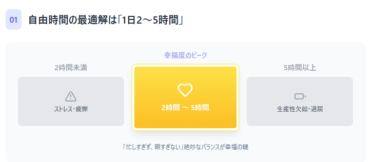 結論から言うと、人が最も幸せを感じる自由時間は「1日に2時間から5時間」でした。