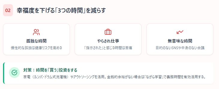 - やらされ仕事の時間 「誰かに指示された」「嫌々やらなければならない」と感じる作業に費やす時間は、幸福度を下げます。人間には「自分で選びたい」という強い心理的欲求があるからです。