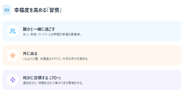 - 「誰かと過ごす」「外に出る」「没頭する」時間を増やす。